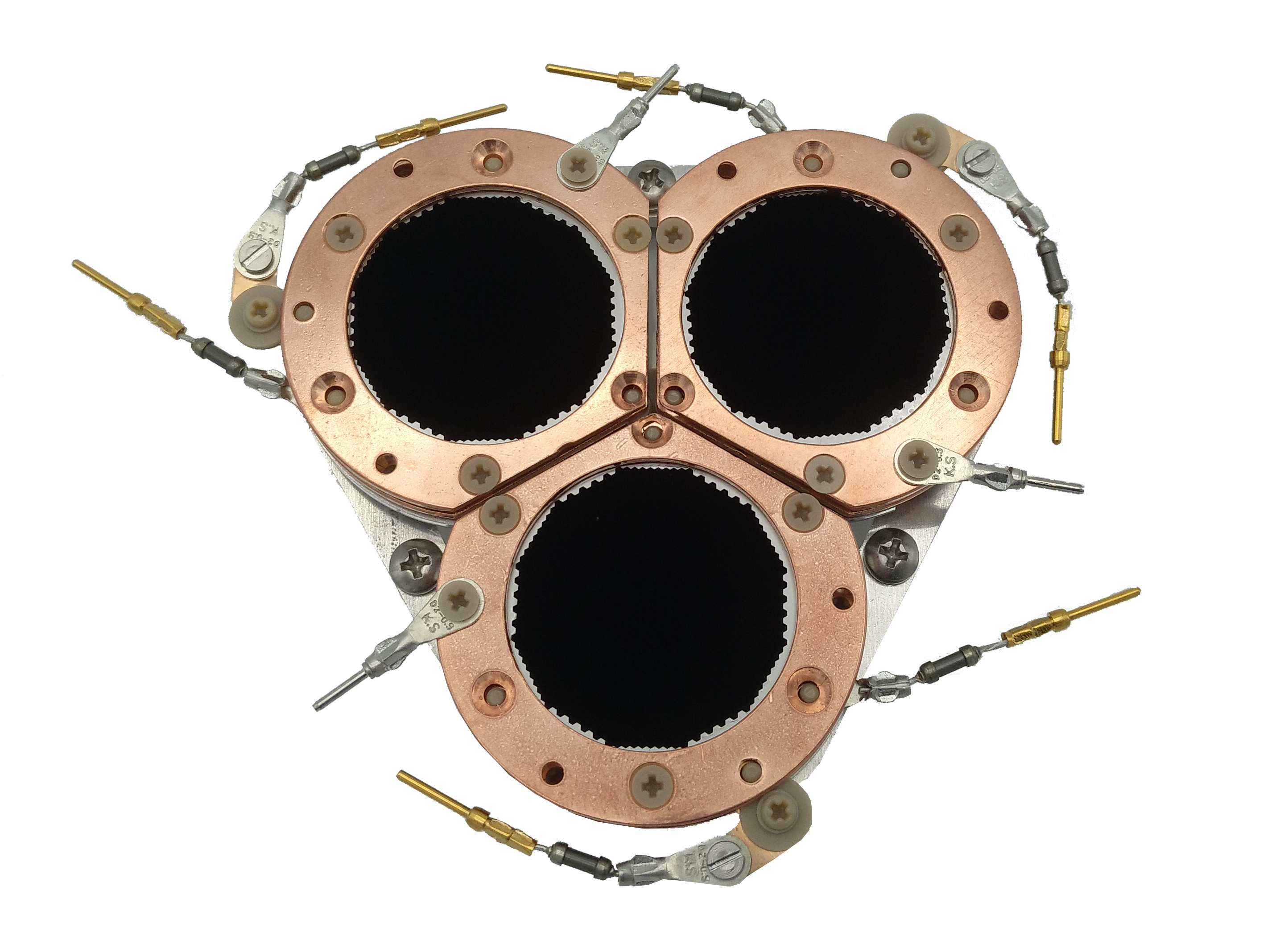 As variation of detectors with “simple” timing anode RoentDek can alternatively provide structured anodes with multiple independent detecting elements. An example is the DET40_5 with five independent anode elements (Pentanode). Signals from each element can be picked up via rear-side contacts. The concept can be expanded to any custom-defined number of elements (“pixels”) with variable shapes.